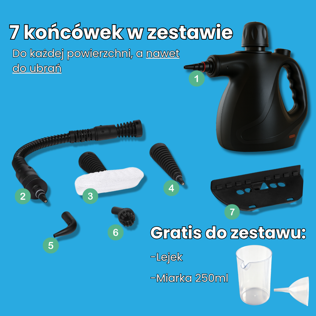 7 końcówek pozwala dotrzeć w każdy zakamarek – od fug i płytek po tapicerkę, szyby i grill.